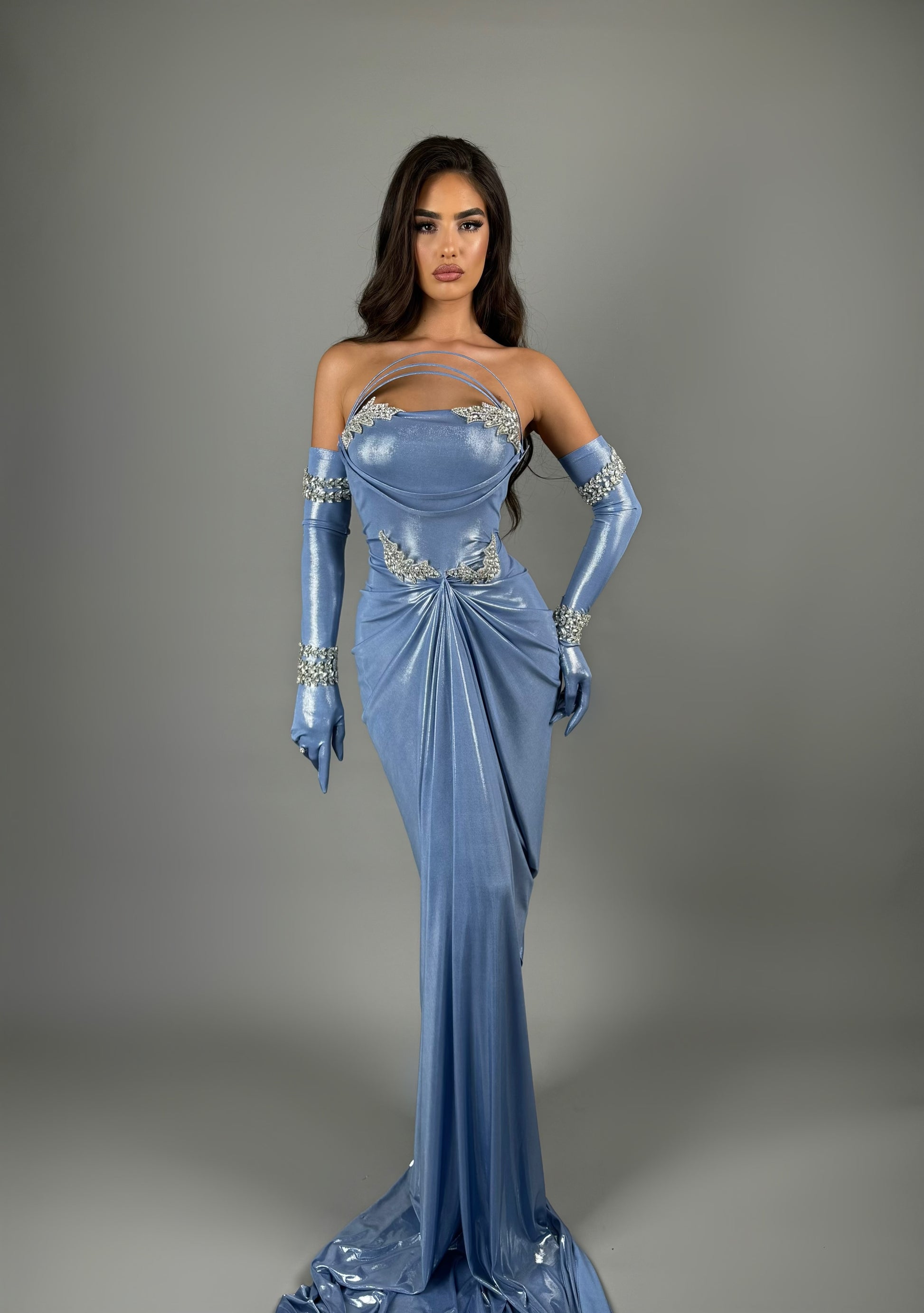 • Long, draped gloves
