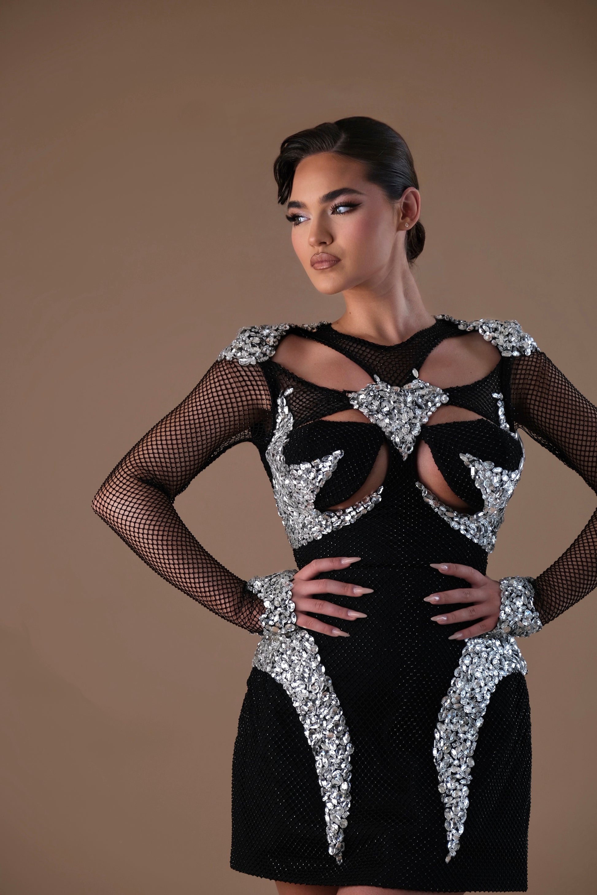 • Heavily hand embellished with silver crystal appliqué in sculptural patterns