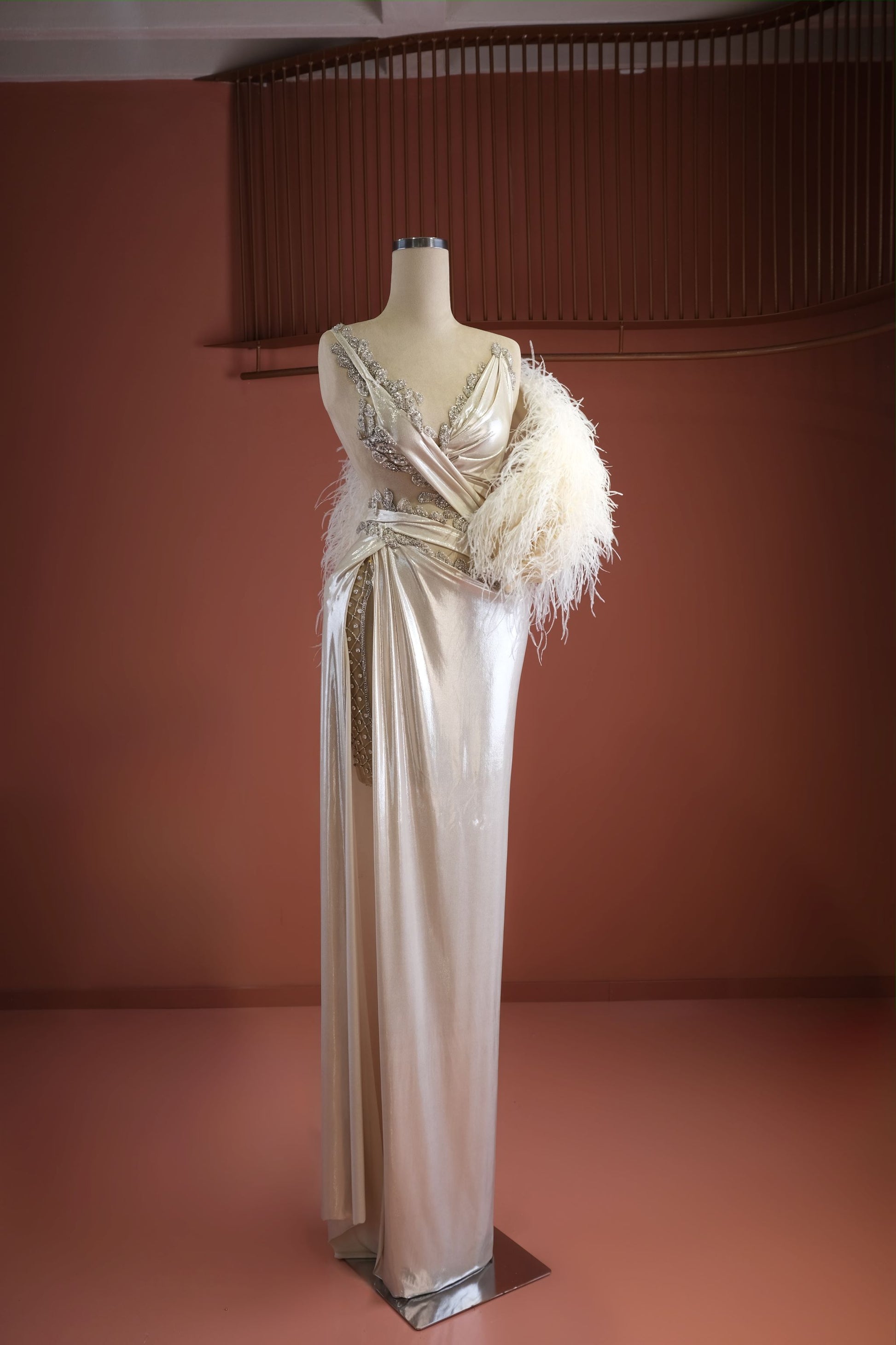 Azra - Beaded Feathered Evening Dress