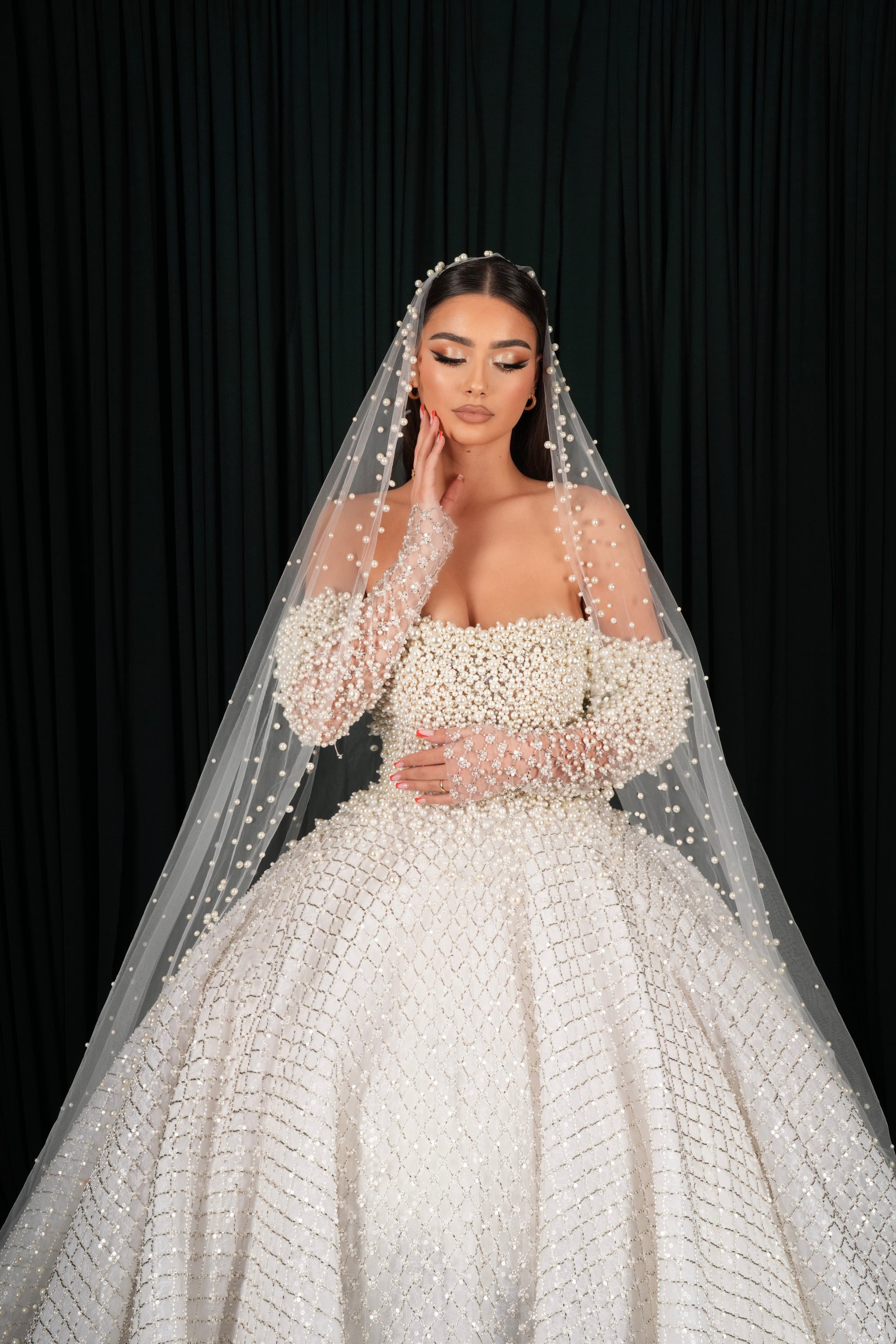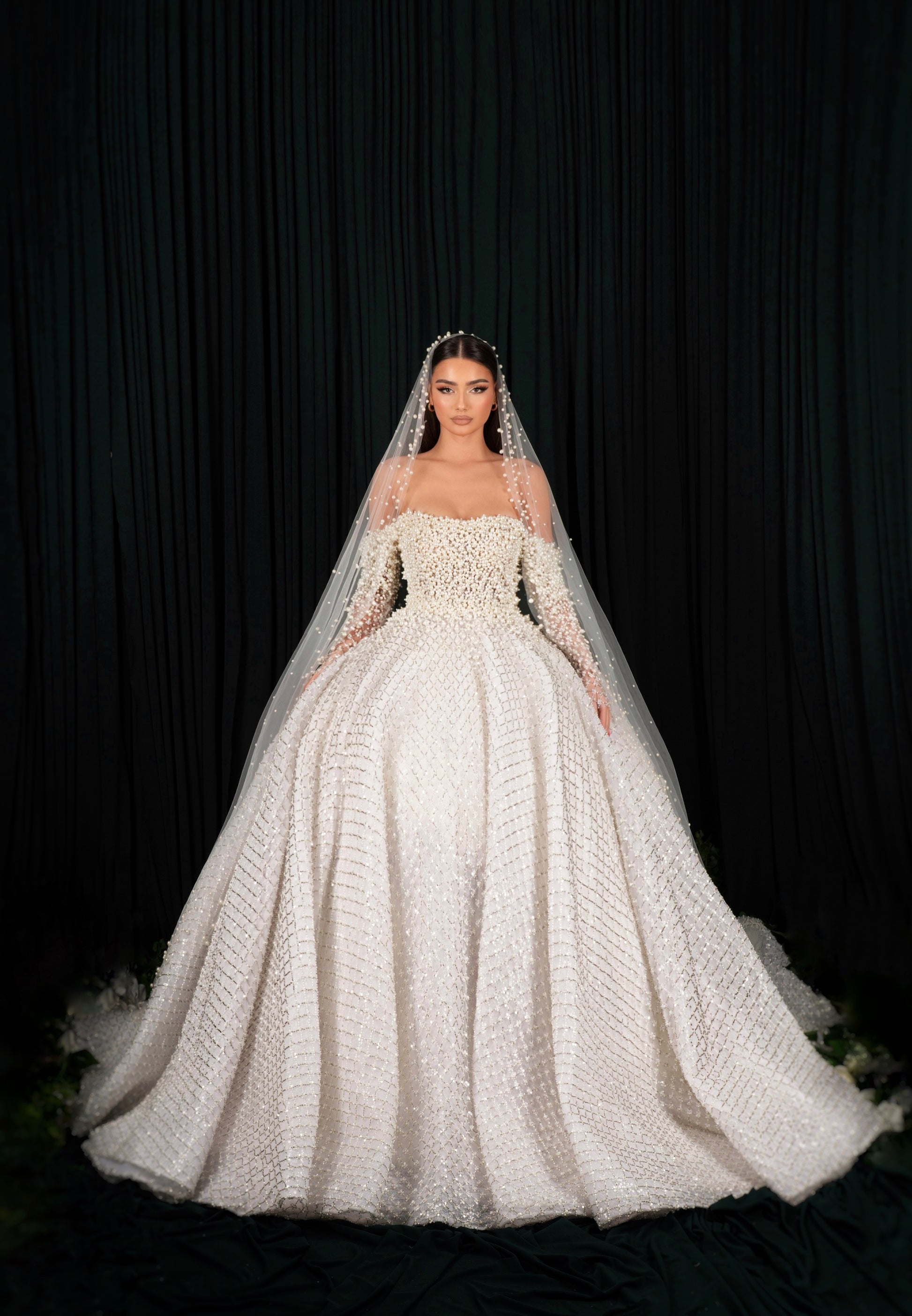 Off-the-shoulder design with a fitted bodice, beautifully adorned with intricate beading