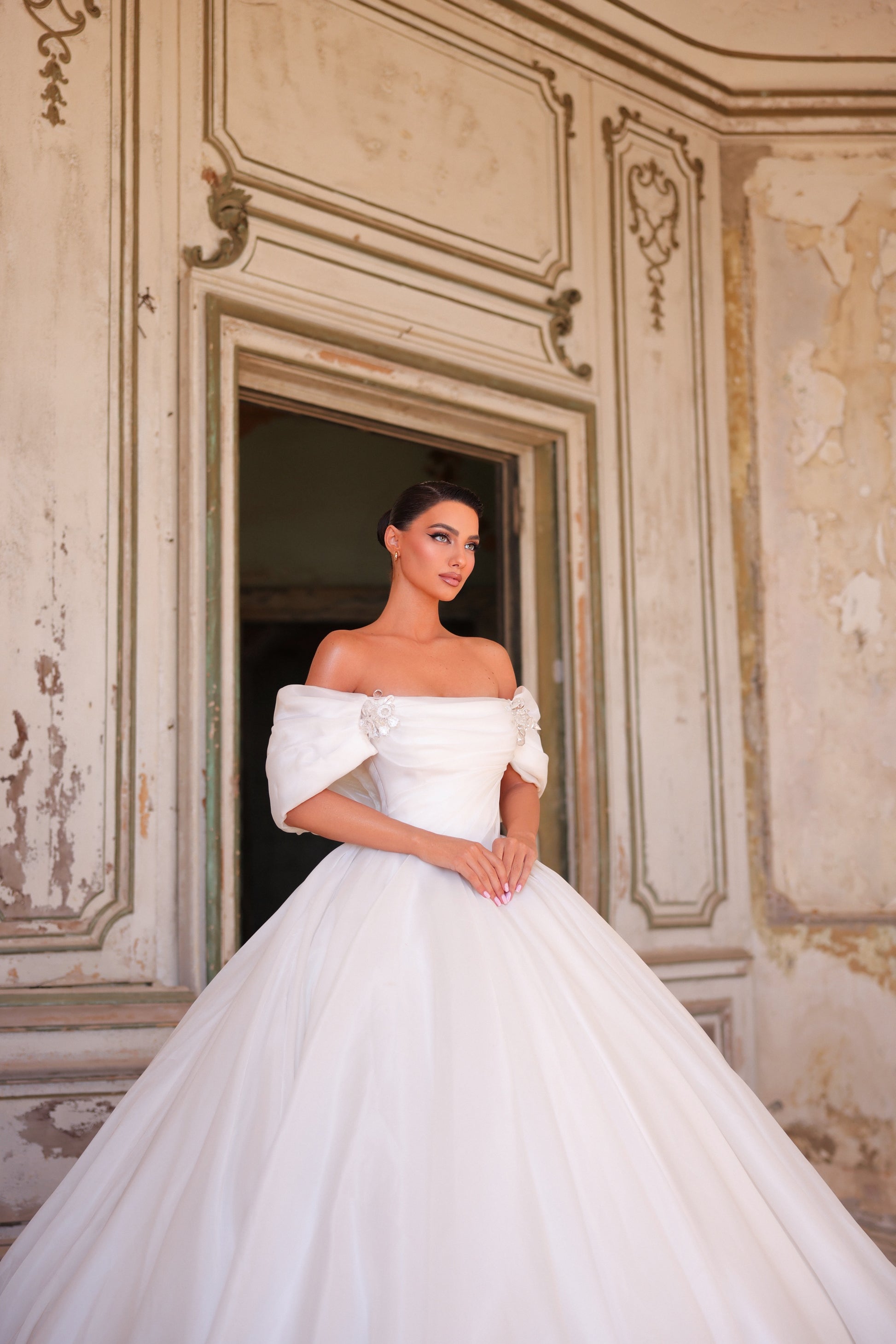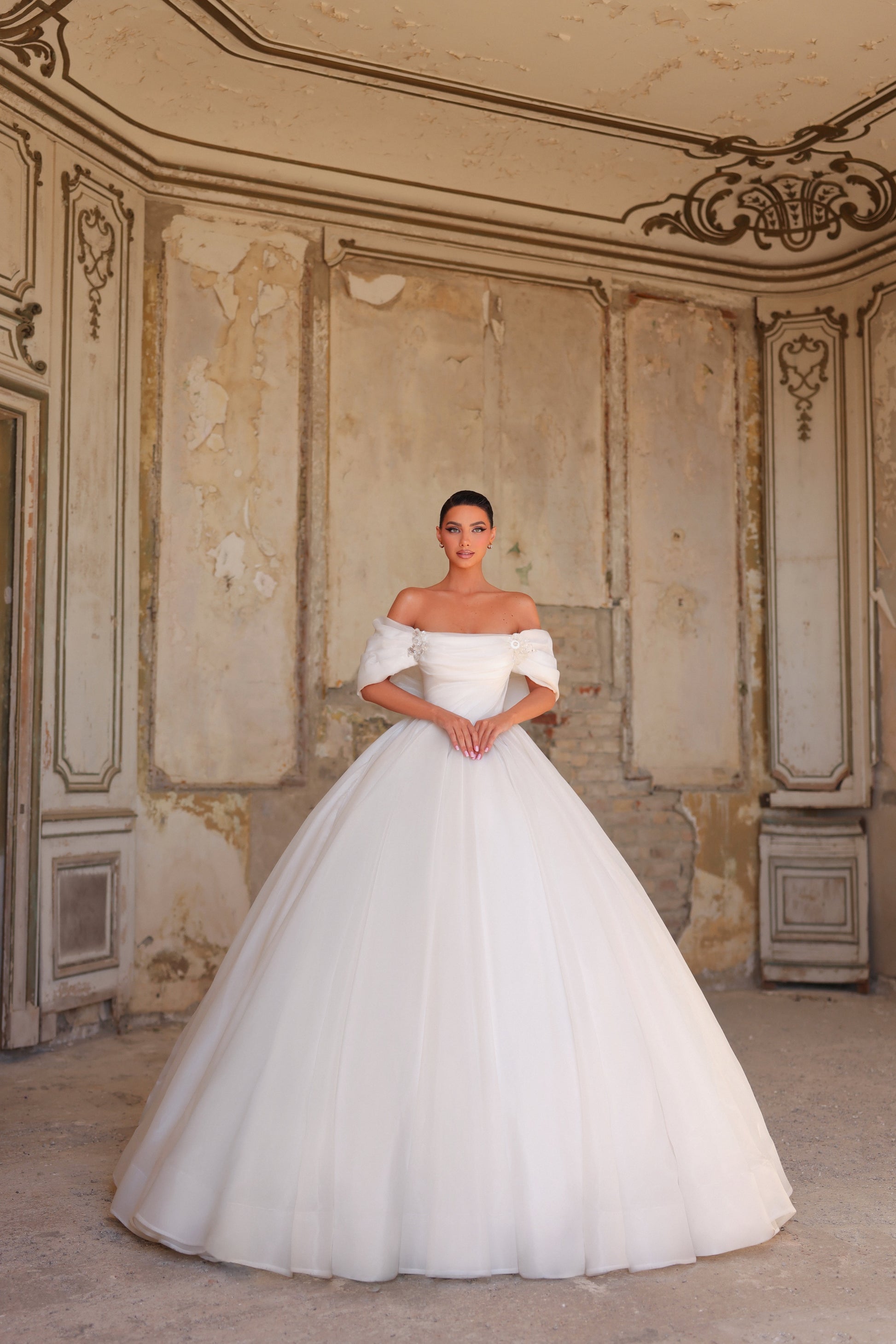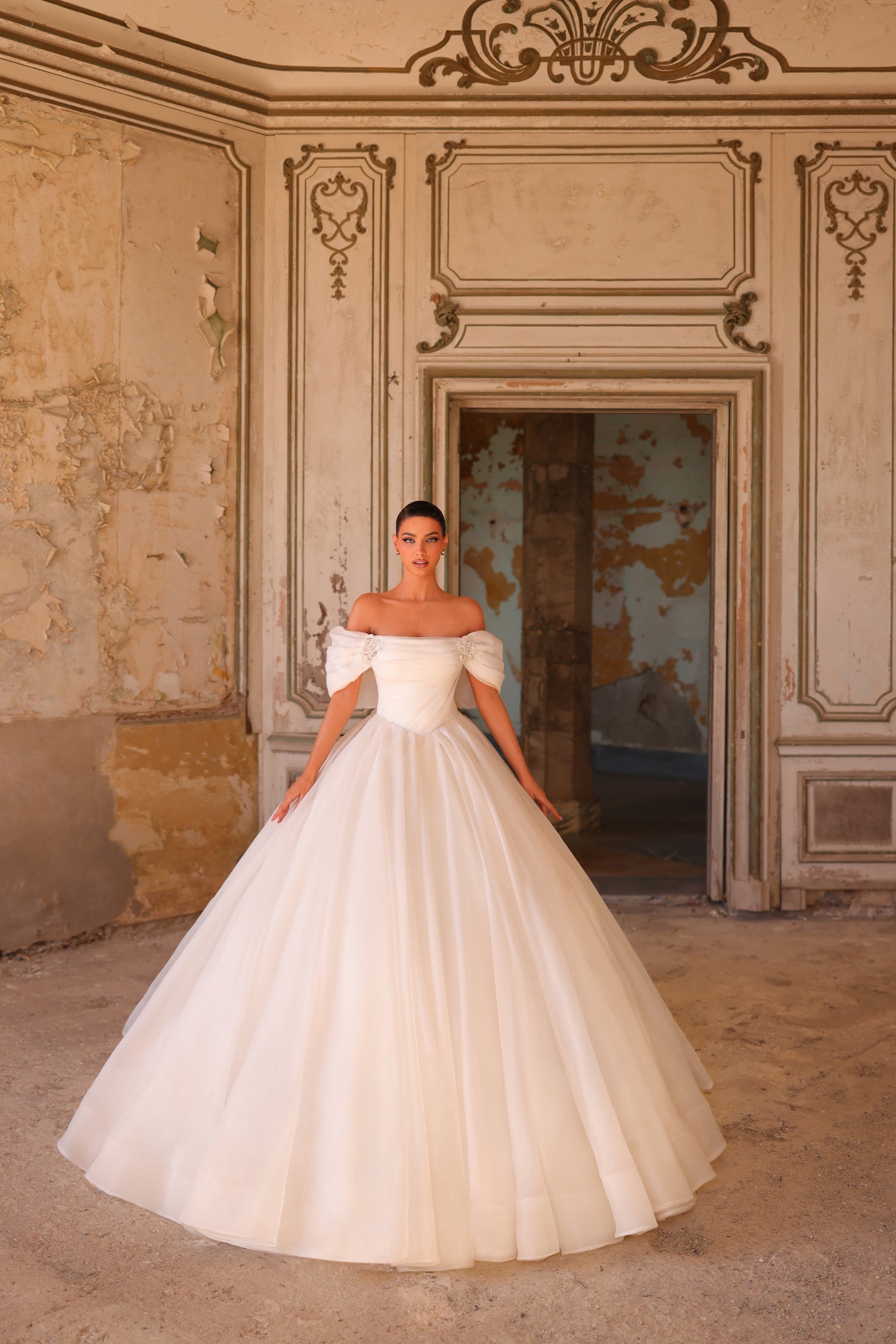 The gown features an off-the-shoulder design with a fitted bodice and a full, floor-length skirt made of layers of tulle