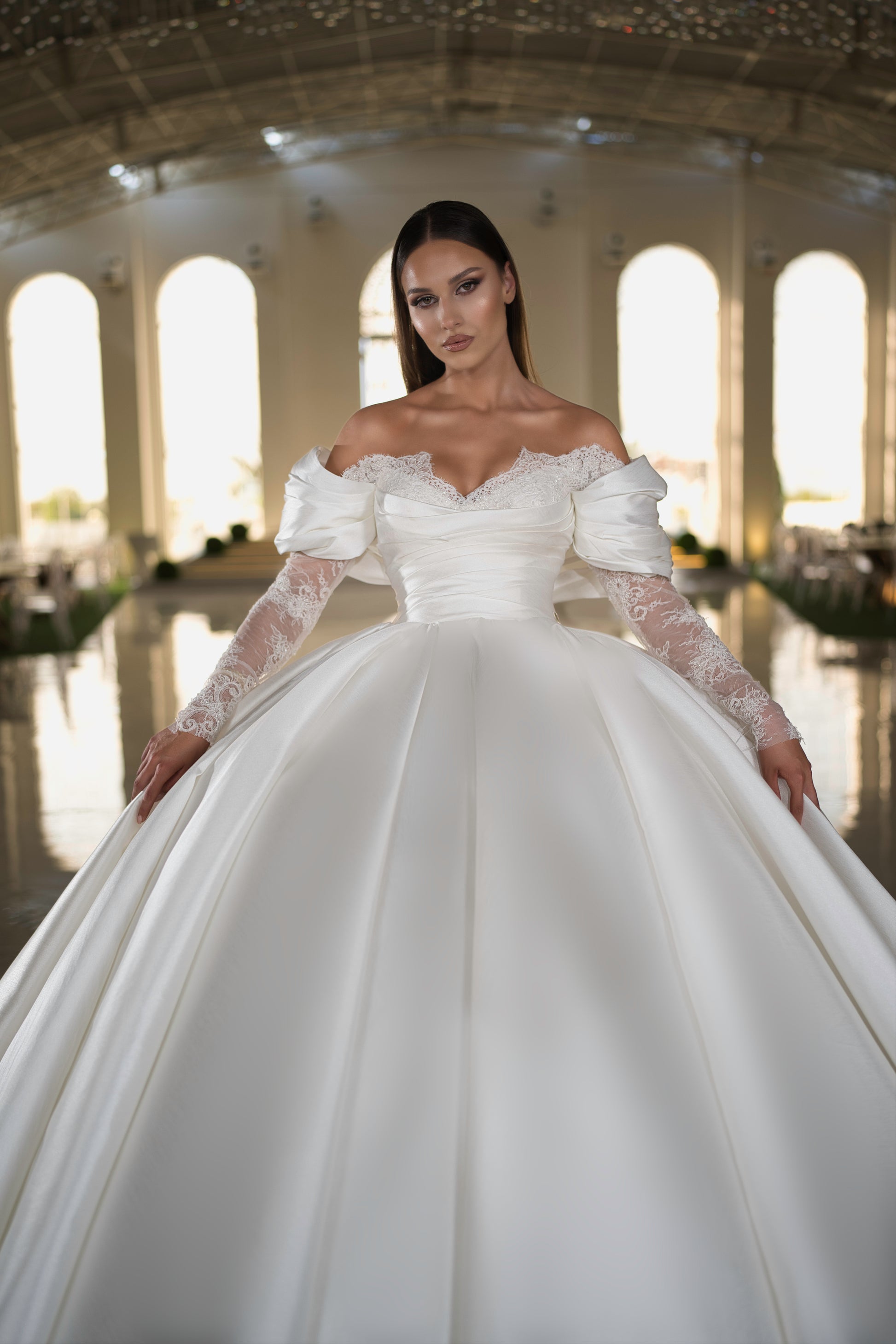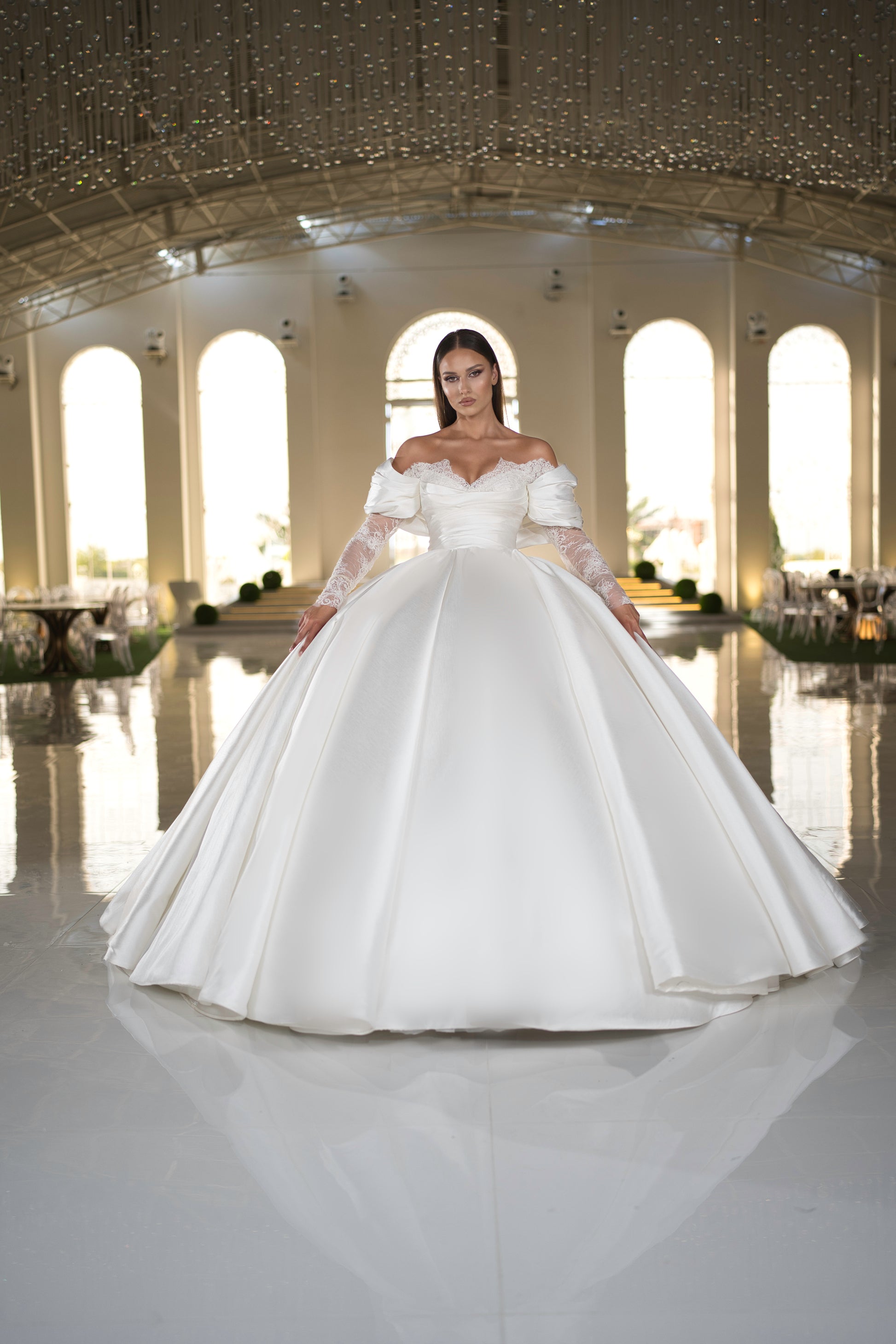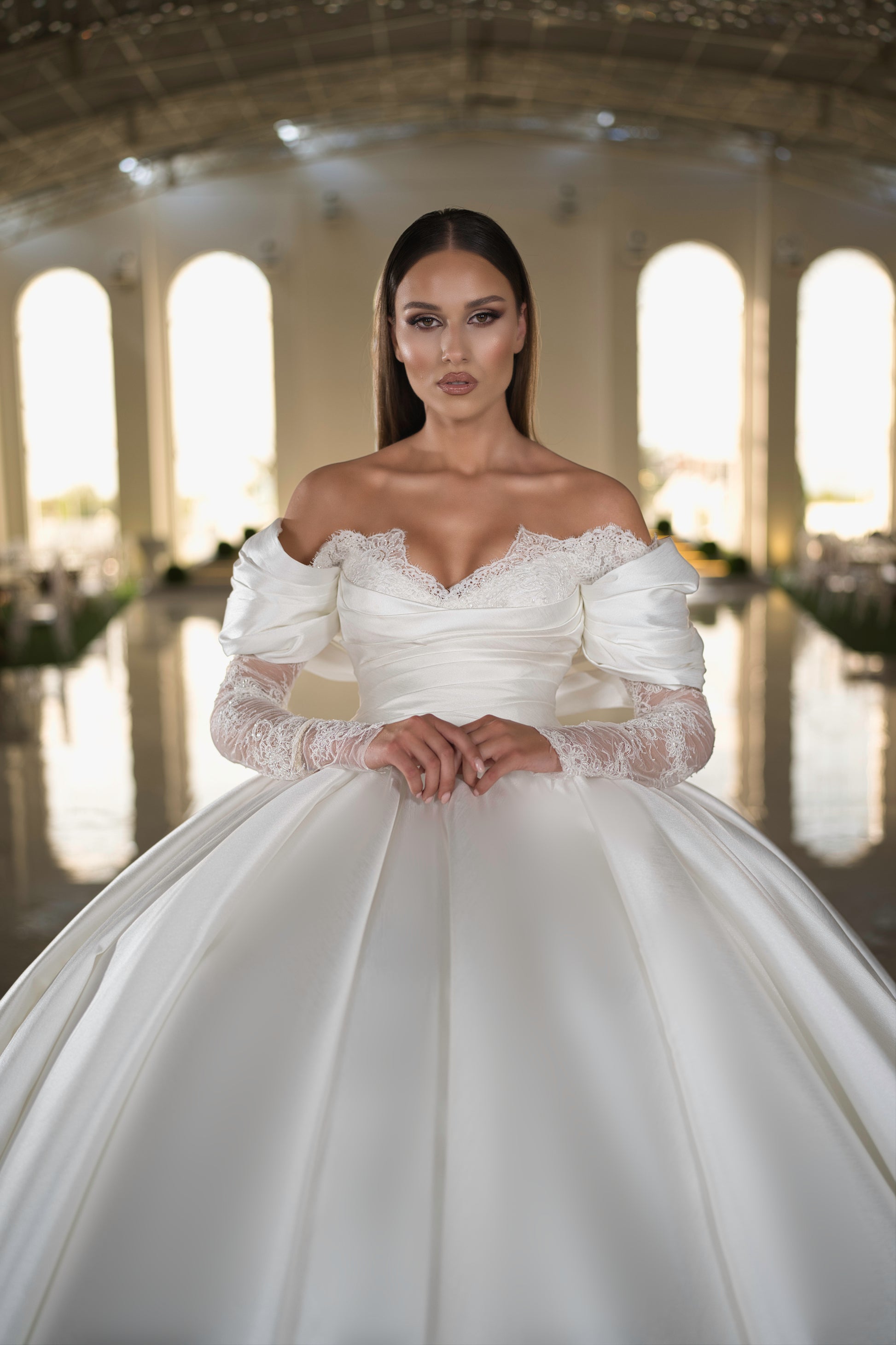 Enter "CARY", a vision crafted from the rich mikado fabric, known for its unique flair and commanding presence. The bodice and sleeves, adorned with pristine white lace, paint a picture of timeless elegance, creating an illusion of a strapless masterpiece.