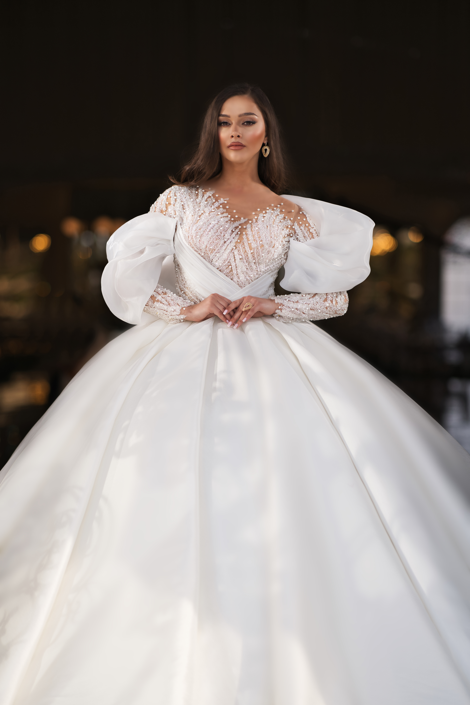 "ISLEY" is that ethereal secret, woven into reality. The exquisite organza, with its delicate ruching, paints a picture of airy dreams and graceful dances. The bodice and sleeves, a canvas of nude tulle, are adorned with intricate pearl designs, each one telling a tale of romance and wonder. Tiny ruffles, like the softest of sighs, add layers of enchantment to this masterpiece.