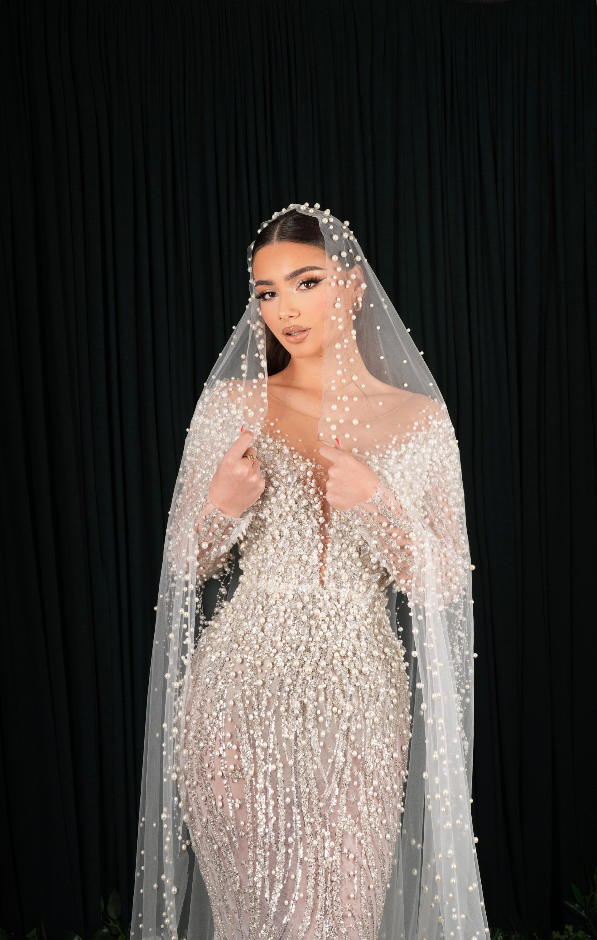 The gown features a mermaid-style silhouette that flares out at the bottom