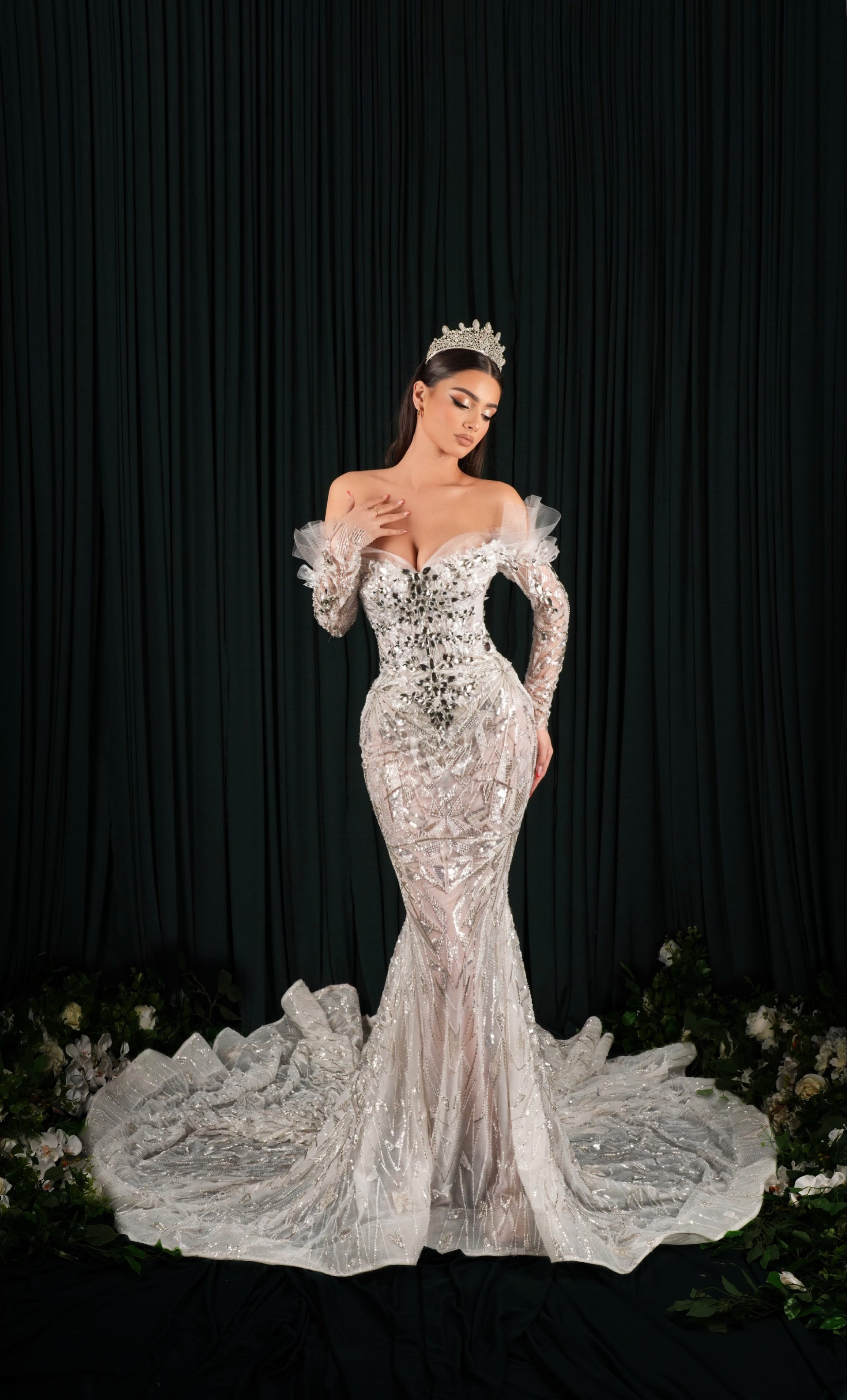 The gown features a mermaid-style shape, fitted through the bodice and hips, then flaring out at the bottom