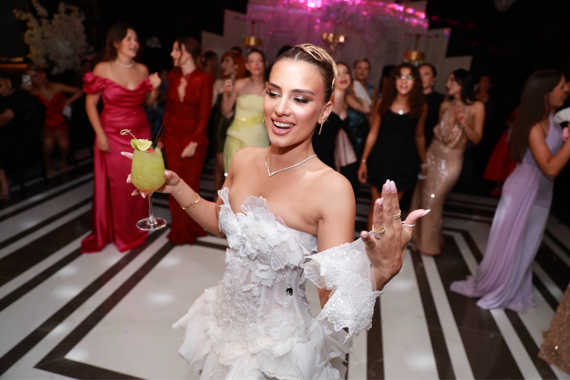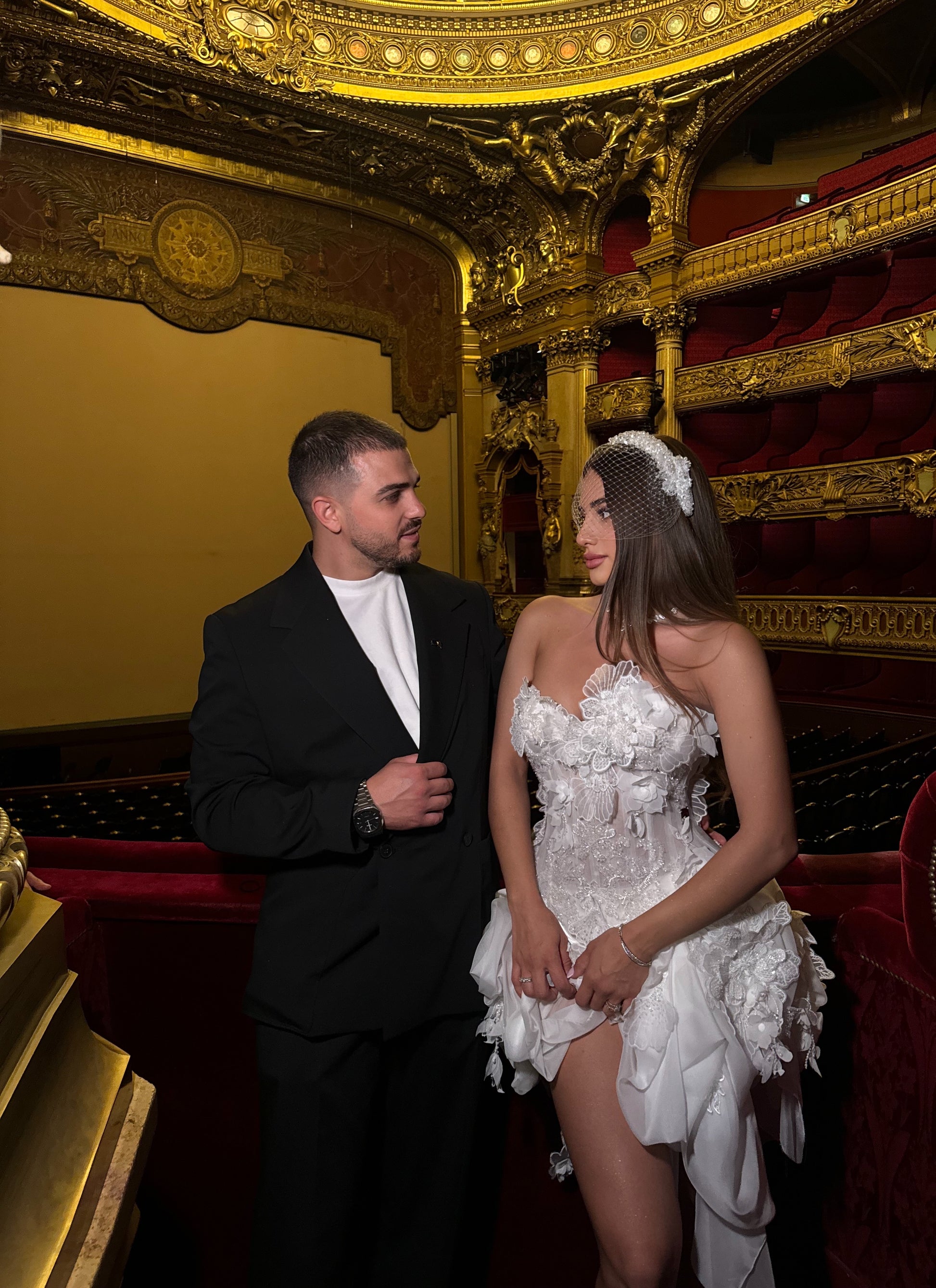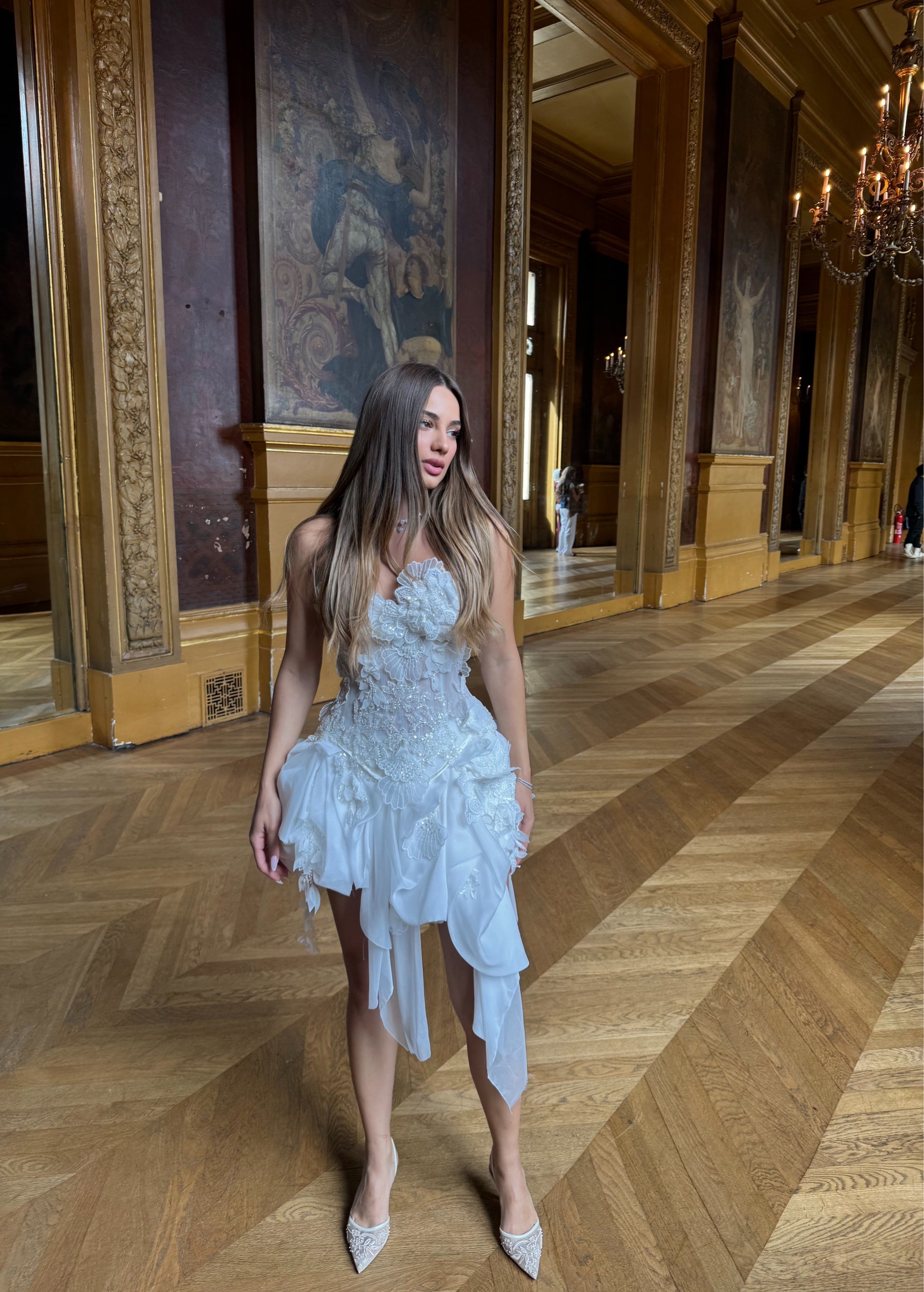 • Strapless structured corset bodice with dramatic floral appliqués and 3D lace embellishments