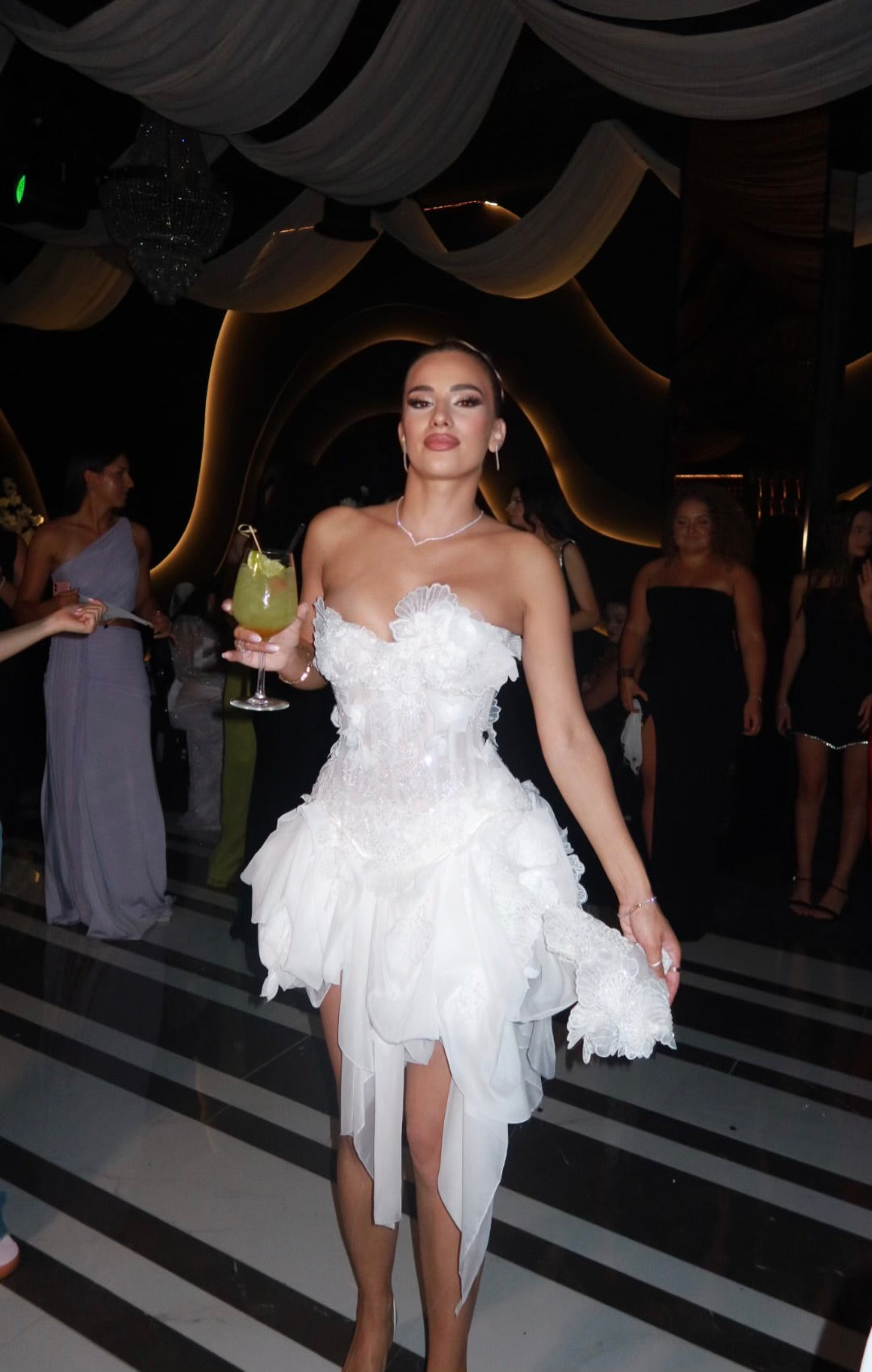 • Asymmetrical, high-volume mini skirt featuring cascading silk drapes and textured lace panels