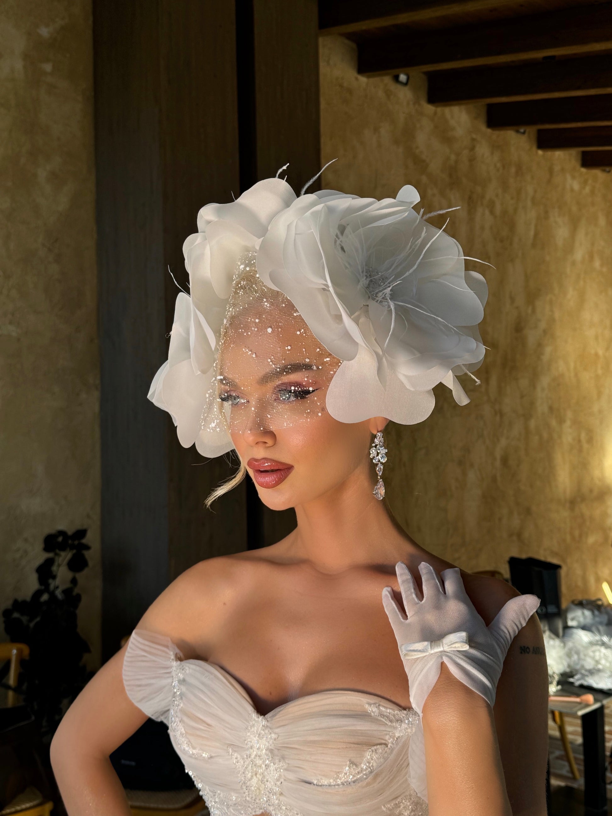 Oversized Floral Headpiece with Crystal Veil & Bow Gloves